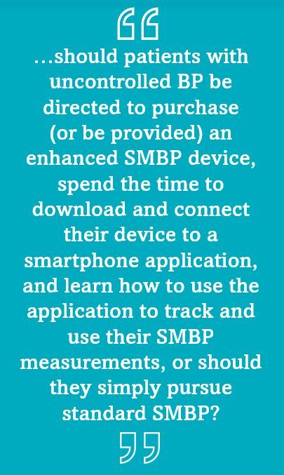 The investigators rephrase the question that prompted the study: “…should patients with uncontrolled BP be directed to purchase (or be provided) an enhanced SMBP device, spend the time to download and connect their device to a smartphone application, and learn how to use the application to track and use their SMBP measurements, or should they simply pursue standard SMBP?”