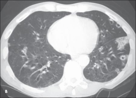 A CT scan of the chest showed subpleural cavitating lung nodules (A and B). Blood cultures grew Staphylococcus aureus, and an echocardiogram confirmed the diagnosis of infective endocarditis.
