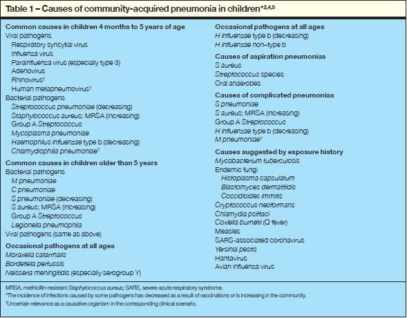 The causes of pediatric pneumonia vary greatly by age and epidemiological risk factors (Table 1).2,4,5 The cause of pneumonia can be established in up to 85% of patients in the research setting when multiple diagnostic methods are used.6 Viral pathogens are particularly important causes of bronchiolitis or pneumonia among children between 4 months and 5 years of age. Important viral pathogens that have been frequently identified include influenza virus, respiratory syncytial virus (RSV), and parainfluenza virus (particularly type 3). Adenovirus occasionally has been associated with severe pneumonia, including recent reports of severe pneumonia secondary to adenovirus 14 infection in previously healthy adults and children.7-9