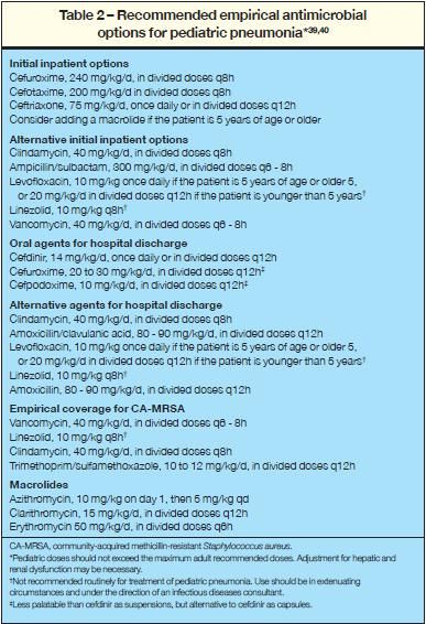 Treatment duration depends on the severity of the pneumonia and has not been carefully studied in clinical trials. In most uncomplicated pneumonias, 10 to 14 days is considered sufficient,4 although recent data from adults suggest that a shorter duration of therapy may be possible with some drugs.51 Three to 4 weeks of therapy has been recommended for S aureus and mixed bacterial empyemas; shorter courses may be possible for H influenzae and S pneumoniae.5