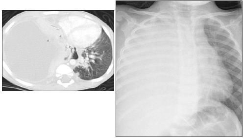 Figure 2 – A 6-month-old girl was admitted with acute onset of fever and respiratory distress. A chest radiograph revealed almost complete opacification of the left hemithorax. A CT scan of the chest demonstrated consolidation of the left lung with low density within the lung, consistent with necrosis, and a large loculated pleural effusion. Drainage of the empyema was performed, and methicillin-resistant