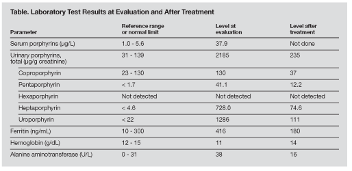 Most heme is synthesized in the bone marrow for hemoglobin and in the liver for cytochromes. Smaller amounts of heme are required for myoglobin, catalase, guanylate cyclase, and nitric oxide synthase.5 With porphyrias related to abnormal heme synthesis in the liver (ie, hepatic porphyrias), abnormal concentrations of heme precursors lead to a spectrum of visceral, neuropsychiatric, hepatic, and cutaneous manifestations.6 Chronic cutaneous manifestations are most prominent with 3 of the hepatic porphyrias: variegate porphyria, hereditary coproporphyria, and porphyria cutanea tarda. In patients with porphyria cutanea tarda, symptoms are generally limited to the skin, whereas patients with variegate porphyria and hereditary coproporphyria classically present with neurological symptoms, muscle weakness, and abdominal pain.3 However, when variegate porphyria and hereditary coproporphyria are identified early, dermatological findings may be the only sign of disease.7,8