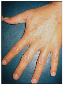 Figure 2.After treatment. Left hand of a 48-year-old African American woman with porphyria cutanea tarda who was coinfected with HIV and hepatitis C virus.