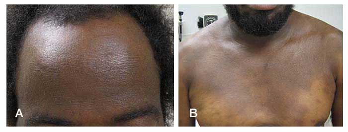 Figure 2. Resolution of the lesions can be seen on the patient's forehead (A) and chest (B).