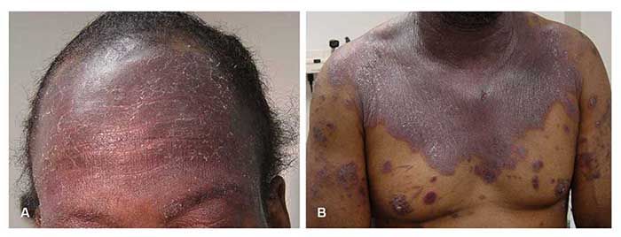 Figure 1. The patient had hyperkeratotic plaque and superficial scaling with reddish-based lesions on his forehead (A) and multiple plaques on his chest (B).