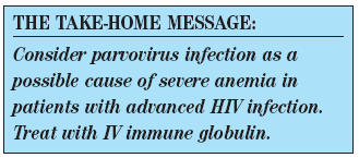 Outcome of this case. Because this patient had profound, symptomatic anemia, he was immediately given packed RBCs. His hemoglobin level rose to 7.0 g/dL and his symptoms abated. Reticulocytes were 0.1% of erythrocytes, and DNA studies were positive for parvovirus B19 infection, confirming the diagnosis. Records were obtained from his health clinic visit; these confirmed that he was HIV-positive and showed that he had a CD4+ cell count of 92/μL at the time of testing. Intravenous immune globulin was administered in the hospital, and 4 weeks after discharge, his hemoglobin level had risen to 10 g/dL. HAART was also initiated.