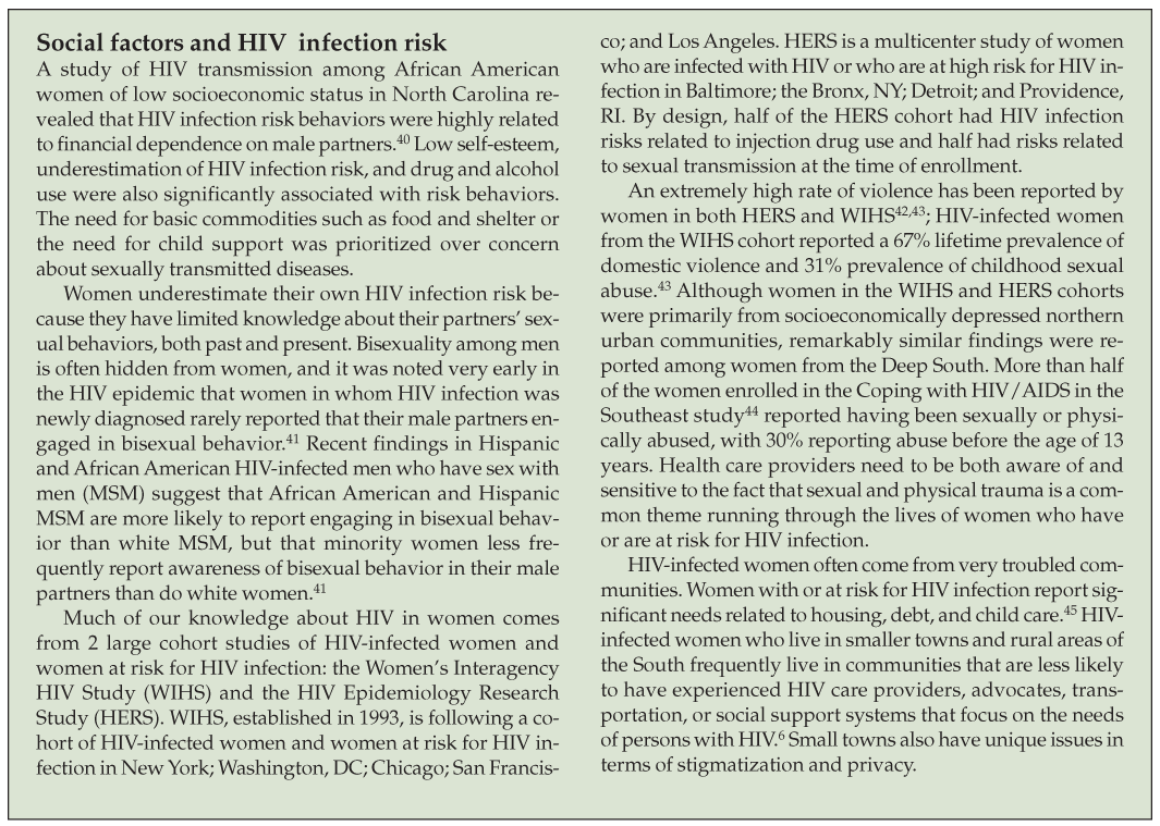 Women tend to have lower viral loads than men, as noted in a number of studies.4 However, rates of disease progression appear to be similar, despite the difference in viral load. The natural history and progression of HIV infection, patient survival rates, and type of HIV-associated illnesses (other than those of the reproductive tract) that emerge are similar in women and men.5 Current treatment guidelines differ for men and women only in regard to issues related to gynecological care, contraception and pregnancy, and perinatal management. Nevertheless, equivalent clinical outcomes will only be achieved if women have equivalent access to care and support. Recent findings from the Coping with HIV/AIDS in the Southeast study (see “Social factors and HIV infection risk”) suggest that HIV-infected women are less educated, less likely to have private health insurance, less likely to be receiving antiretroviral therapy, and less likely to have a suppressed viral load than are their male counterparts.6 Addressing such problems will be critical to the health and survival of HIV-infected women.