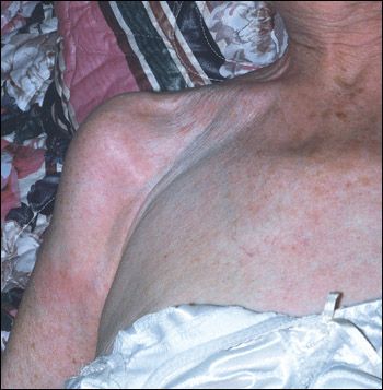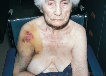 The image is strikingly upsetting, both because of the deformity of the upper humerus and because the patient's expression-mouth and eyes both-appears so very grim and is easy to overinterpret as indicating extreme pain. In fact, she was not disconsolate, but the camera caught her worst moment. Curiously, the severe bruising appears very deep distally, so that there is an indigo-to-green discoloration "from within," whereas red cells are near the surface in the most proximal portion, despite a paucity of surface abrasion, and also on the medial portion of the anterior axilla and onto the upper outermost part of the breast. Marked yellow-brown discoloration surrounding the purple areas suggests either breakdown of red cells or staining, principally by serum with lesser numbers of erythrocytes.