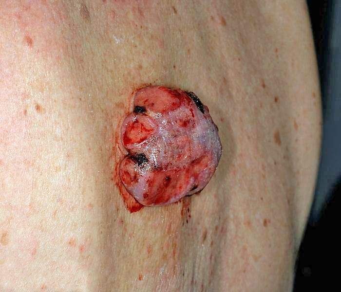 Key point: This appears to be a tumor. The size and history of bleeding suggest a malignancy. There is no way to know if this is a primary cutaneous neoplasm (basal cell or squamous cell carcinoma, soft tissue sarcoma, malignant melanoma) or a cutaneous metastasis from visceral carcinoma without performing a biopsy. Aside from routine histology, tumor markers and gene mutations may be important in determining optimal therapy. A biopsy disclosed malignant melanoma. A systemic workup revealed widespread, multi-organ metastatic disease.
