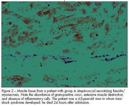 Bullous lesions associated with necrotizing fasciitis and gas gangrene result from infarction of cutaneous vessels and are usually maroon, red, or blue.2,3 Because punch biopsy may be associated with a "sampling error," definitive diagnosis rests on surgical exploration. Histologically, soft tissues infected with group A streptococci or histotoxic clostridia will show extensive tissue destruction with or without large numbers of organisms and a paucity of infiltrating granulocytes (Figure 2). Thrombosis of the microvasculature and even of larger vessels may be marked. This picture is decidedly different from that seen with S aureus, Haemophilus influenzae, or Streptococcus pneumoniae infections, which are characterized by minimal tissue destruction and a luxuriant leukocytic response at the site of infection. Thus, histologic evaluation, appropriate Gram stain, and culture will establish a diagnosis and guide management, which would include antibiotic treatment and debridement if a necrotizing process is implicated.