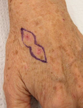 Two skin carcinomas that are in close proximity can be removed in a single excision.