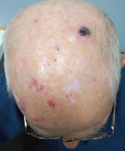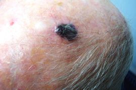 A 78-year-old man with many past skin cancers presents with a hard, slightly tender, dark-colored nodule on the scalp.