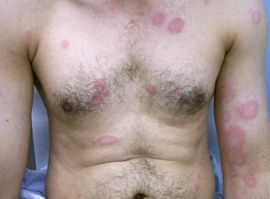 A 38-year-old HIV-positive man presents with an intensely itchy eruption involving the neck and upper torso.