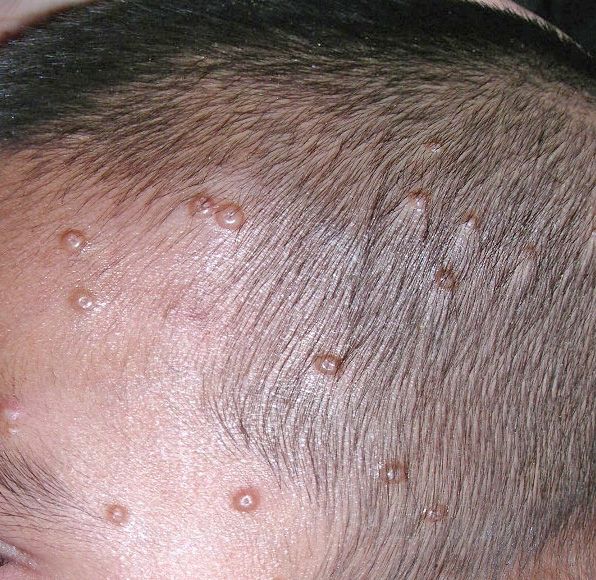 Key point: The globoid-shaped papules with central umbilication are typical for molluscum contagiosum, a pox virus infection spread by skin-to-skin contact.
