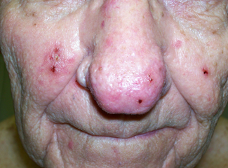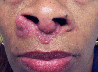 33-year-old African American woman presents with asymptomatic, slowly expanding, firm, reddish purple plaques at the distal nose and within the nasal septum. Her only additional complaint is dyspnea on exertion.