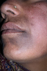 Middle-aged Pakistani woman has been applying a “bleaching” cream to a small dark spot on her face. Instead of removing the spot, she has paradoxically developed a widespread area of increased pigmentation.