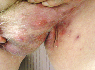 Key point: This is intertrigo, or multi-faceted, inflammation involving skin folds. The presence of discrete pustules suggests either staphylococcal or candidal involvement. A pustule roof should be examined under potassium hydroxide for the presence of yeast, and the pus from another lesion sent for bacterial culture.