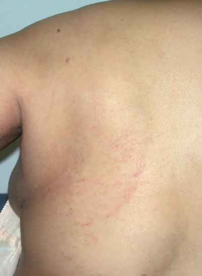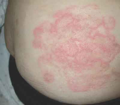 An annular plaque with a rim of scaly erythema arose on this woman's back. Tinea corporis was diagnosed.
