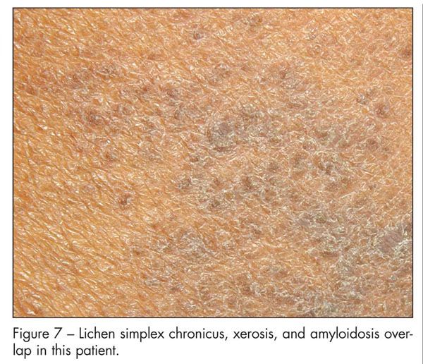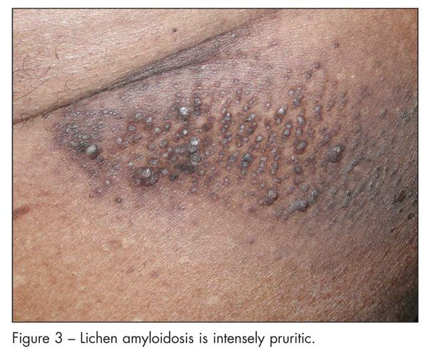 Lichen amyloidosis presents as an intensely itchy eruption of red-brown papules on the shins, thighs, feet, and forearms (Figure 3). The papules can have a reticulated or rippled appearance. Isolated papules can occur as well. Lichen amyloidosis most often first appears in men