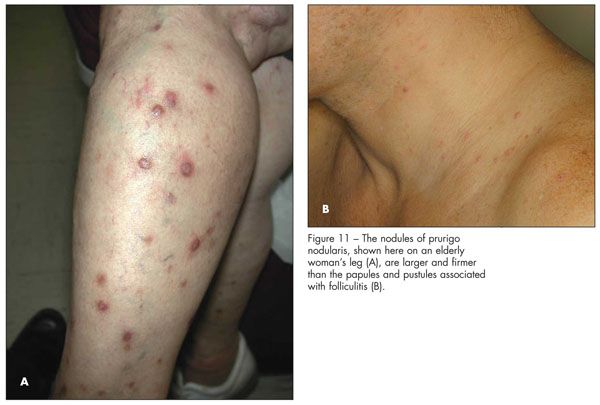 PRURIGO NODULARISClinical features. Prurigo nodularis manifests as hard, hyperpigmented nodules, 1 to 3 cm in diameter, with rough, flat, umbilicated, or crusted surfaces. The papules of prurigo nodularis are larger and firmer than the papules and pustules of folliculitis (Figure 11). Crust and scale may cover recently scratched prurigo nodularis. The skin between the nodules is often dry. Early prurigo nodularis is red and may have some hive-like features.
