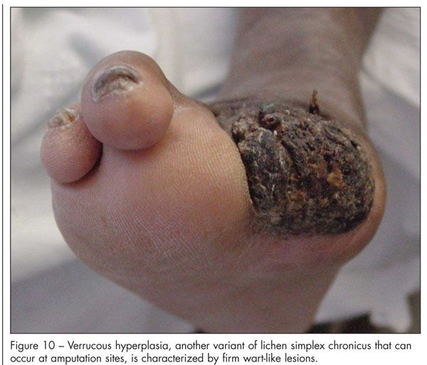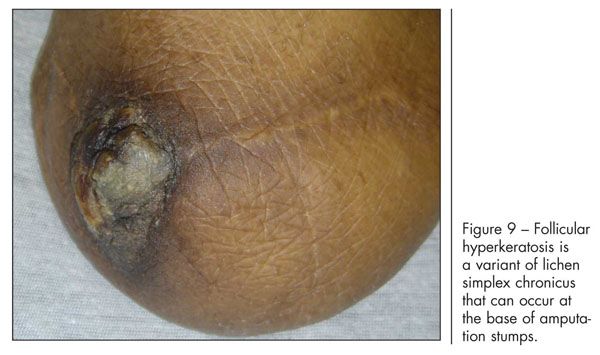 Variants of LSC can exist in amputees. These variants include follicular hyperkeratosis (which can be peeled away with a fingernail) (Figure 9) at the bottom of amputation stumps attached to ill-fitting prostheses and wart-like lesions (verrucous hyperplasia) (Figure 10), which are firm and cannot be peeled away. Treatment involves better-fitting shoes and prostheses.