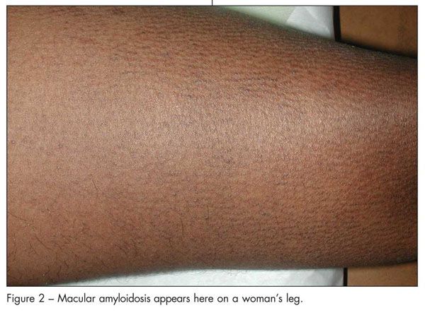 Macular amyloidosis starts as flat dusky-brown or grayish macules that may coalesce to form reticulated or rippled brown patches. It manifests symmetrically over the upper back between the shoulder blades, on the chest, and sometimes on the arms and legs (Figure 2). Macular amyloidosis