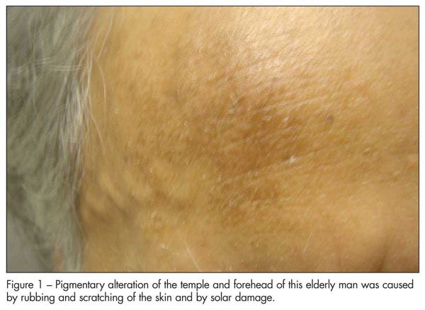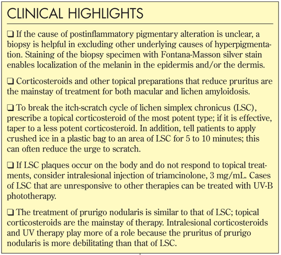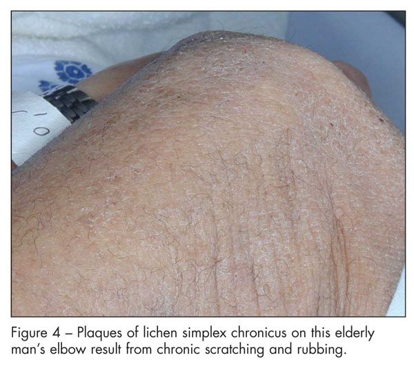 Physical changes that occur in aging skin (eg, dryness and thinning) can result in pruritus and cause patients to rub, scratch, and pick at their skin. These activities produce various dermatoses and reactive changes in the skin, such as postinflammatory pigmentary alteration. Lichen simplex chronicus (LSC) develops as a physiological cutaneous response to repetitive scratching or rubbing. First-line treatment consists of topical corticosteroids and application of ice to reduce the sensation of itching. Like LSC, prurigo nodularis results from rubbing and scratching the skin. Treatment is similar; however, intralesional corticosteroids and UV therapy play more of a role because prurigo nodularis is more intensely pruritic than LSC.