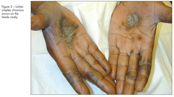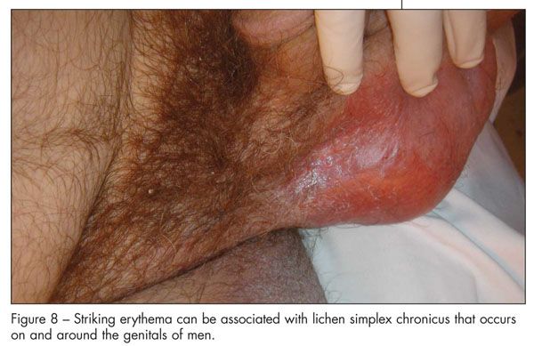 LSC can occur on any body area that the patient can reach to scratch, particularly the scalp, nape of neck, extensor surface of forearms and elbows (Figure 4), vulva and scrotum, outer aspect of the upper medial thighs, knees, lower legs, ankles and, rarely, the hands (Figure 5). It can be associated with erosion and xerosis (Figure 6). There can be overlap between LSC, xerosis, and amyloidosis (Figure 7). LSC that occurs on and around the genitals of men can be marked by striking erythema (Figure 8).