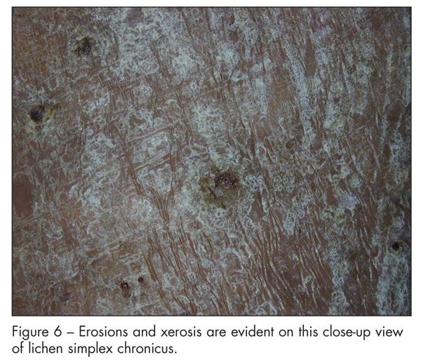 If plaques occur on the body and do not respond to topical treatments, I inject triamcinolone, 3 mg/mL, into the lesions. LSC may become secondarily infected if erosions develop after it is scratched; in this case, it should be treated with topical mupirocin. Cases of LSC unresponsive to other therapies can be treated with UV-B phototherapy.5 I do not find that oral antihistamines are effective for LSC. No therapy