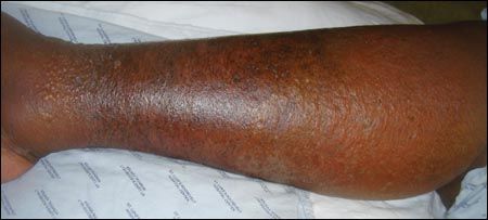 Figure 1 – Stasis dermatitis is seen here on the leg of an elderly woman. This bilateral circumferential dermatitis is characterized by lichenified and hyperpigmented plaques.
