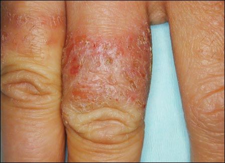Figure 7 – The pattern of erythema, vesiculation, and edema on this man's finger suggests allergic contact dermatitis. The suspected culprit was nickel in the ring he habitually wore.