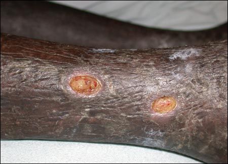 Figure 4 – Ulcers have developed on the leg of this patient with stasis dermatitis.