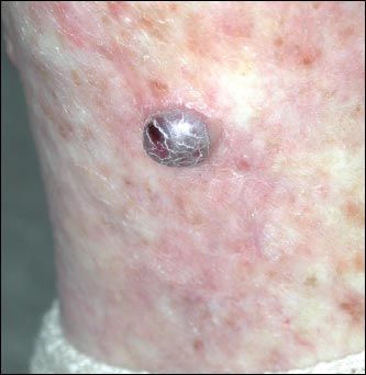 Figure 5 – This violaceous nodule resembles classic Kaposi sarcoma but is actually a rare manifestation of stasis dermatitis, which has been called pseudo-Kaposi sarcoma, or acroangiodermatitis.