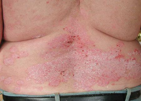 Figure 1 – The erythematous, scaling, well-demarcated lesions of plaque psoriasis are seen here in an elderly man.