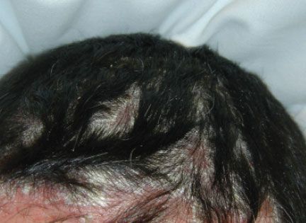 Figure 2 – Sebopsoriasis is evident on this patient’s scalp. This type of psoriasis is common among elderly persons.