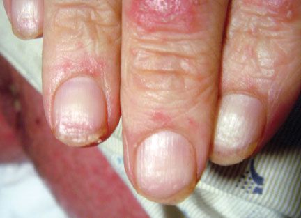 Figure 6 – Pitting and subungual hyperkeratosis are evident in this patient with nail psoriasis.