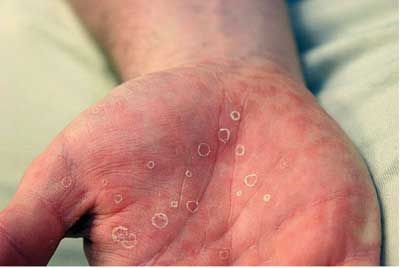 A 24-year-old HIV-positive homosexual man presented with a macular rash on his palms and soles. The lesions were not pruritic or painful. He also had a brighter, more inflamed rash in the groin and antecubital fossae.