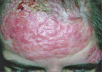 A 31-year-old woman presents for evaluation of an asymptomatic, firm plaque on the forehead. Lesions of similar size and consistency were present at the nape of the neck and on the chest. A biopsy was performed. It revealed almost pure sheets of plasma cells in the dermis. A syphilis serology was obtained; results were positive.