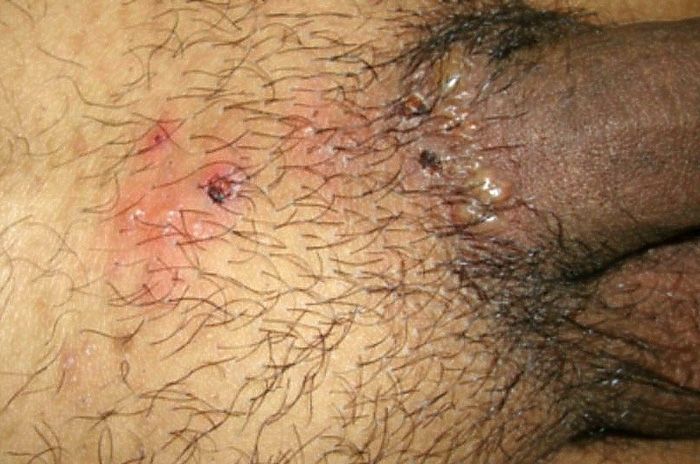 A 28-year-old unmarried man was dating widely, but always wore a condom during intercourse. One week after sex with a new partner, a painful rash developed at the base of the penis.