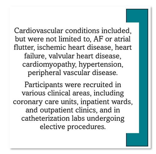 Median age of the 483-participant cohort was 66 years and approximately one-quarter (29%) were women. Participants, recruited from 3 tertiary hospital in the UK, were enrolled between December 2021 and December 2022. Inclusion required a diagnosis of cardiovascular disease documented in the electronic health record (more at right). Participants were randomly assigned to 1 of 2 investigation arms with group 1 undergoing SL-ECG recording with the CART Ring first, followed by the Apple Watch, and group 2 following the reverse order, Apple Watch recording first, followed by the CART Ring.1