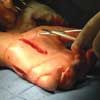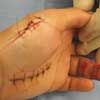 The day after the fasciotomies were performed, the hand surgeon used a vacuum-assisted closure device (VAC; KCI International, San Antonio, Tex) to the open wounds to remove interstitial fluid and debris and to promote wound closure. This negative pressure device was used for 5 days (there were 2 dressing changes during that time). On the sixth postoperative day, the patient returned to the operating room where all of his wounds were closed except for the ring finger fasciotomy site (Figure 3).
