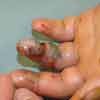 The 2 affected fingers had swelled immediately and moderate edema extended to the palmar crease. The fingers were initially slightly dusky distally, with 3-second capillary refill. The ring finger was the most obviously affected, and had bled immediately after the bite. The medics had applied a sterile gauze dressing with ace wrap and ice pack.