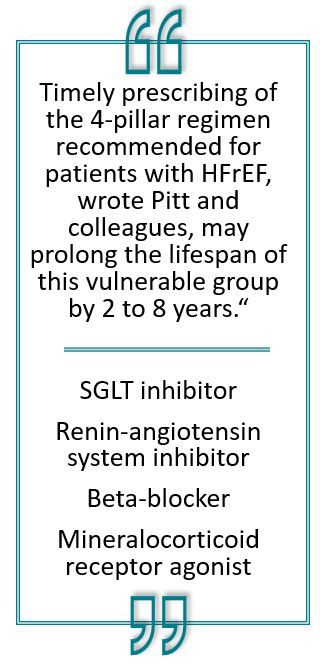 "Initiation of an SGLT inhibitor such as sotagliflozin along with other guideline-recommended HF therapies in patients hospitalized for WHF is relatively well-tolerated," wrote the investigators, and also "is predictive of a higher likelihood [of] appropriate HF therapy being maintained in the long term." Delaying initiation until after discharge, they caution, is associated with "a 75% chance guideline-recommended HF therapies will not be started within the next year." Timely prescribing of the 4-pillar regimen recommended for patients with HFrEF, wrote Pitt and colleagues, "may prolong the lifespan of this vulnerable group by 2 to 8 years."