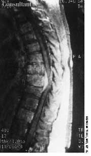Back pain and weakness of both legs had bothered a 60-year-old woman for 1 week. Left breast cancer, stage 2, had been diagnosed 2 years before. An MRI scan of the thoracic spine demonstrates a lesion at T8 that compresses the spinal cord. Spinal cord compression secondary to metastic lesion follows brain metastasis as the most common neurological complication of malignancy.