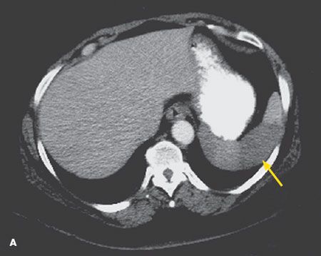 In adults, splenic infarction occurs in the context of embolic diseases, hematological malignancies, aortic dissection, splenic torsion, or vasculitis.1 Infarction usually presents with left upper quadrant pain, which may have a pleuritic component and which may radiate to the left shoulder. In half of affected patients, anemia and leukocytosis may arise.2 Complications include abscess or pseudocyst formation, rupture, and hemorrhage.