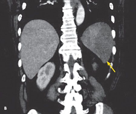 An abdominal CT scan revealed a focal, 5-cm, wedge-shaped area of decreased density in the anterior aspect of the spleen in axial view (A, arrow) and coronal view (B, arrow). This finding is consistent with splenic infarction.