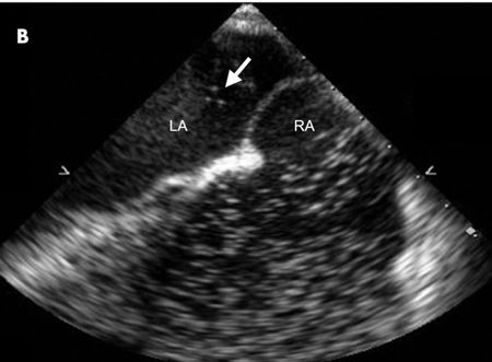 A CT scan of the chest revealed large bilateral pulmonary emboli. A heparin weight-based protocol was started, and transthoracic echocardiography was performed to look for signs of right heart strain. The imaging revealed what appeared to be 2 large echodense structures within the left and right atria. A follow-up transesophageal echocardiography (TEE) revealed a large mobile echogenic structure of 3.6 X 1.5 cm traversing the intra-atrial septum at the level of the foramen ovale, consistent with a thrombus-in-transit (A). During the procedure, the patient began retching and repeated viewing of the intra-atrial septum revealed that the thrombus had completely disappeared. An agitated saline study showed contrast bubbles passing from the right atrium (RA) to the left atrium (LA), confirming the presence of a patent foramen ovale (B).