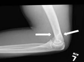 FOOSH (fall on outstretched hand) injury often results from slipping on ice, as well as skiing and snowboarding. Here a 27-year-old man presented a day after sustaining a FOOSH injury while roller skating. He complained of pain when pronating and supinating his left arm, but there were no limitations in range of motion. A lateral plain x-ray film shows an anterior and posterior fat pad sign on the left elbow. A second image of a posteroanterior view also revealed a slight hematoma positioned medially and just inferior to the radial head.