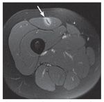 Quadriceps muscle strains frequently occur in sports that require repetitive kicking and sprinting. An axial MRI view of a rectus femoris central tendon injury shows fluid enhancement around the central tendon, the acute bull’s-eye lesion (arrow).