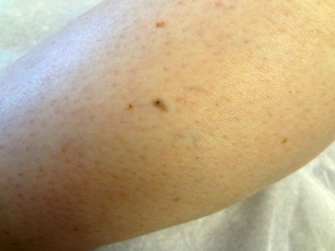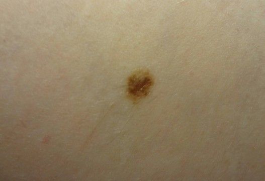 During a total body skin check of a 47-year-old woman with a history of non-melanoma skin cancer, a 5- x 3-mm pigmented macule was noted on the anteromedial aspect of her right foreleg.